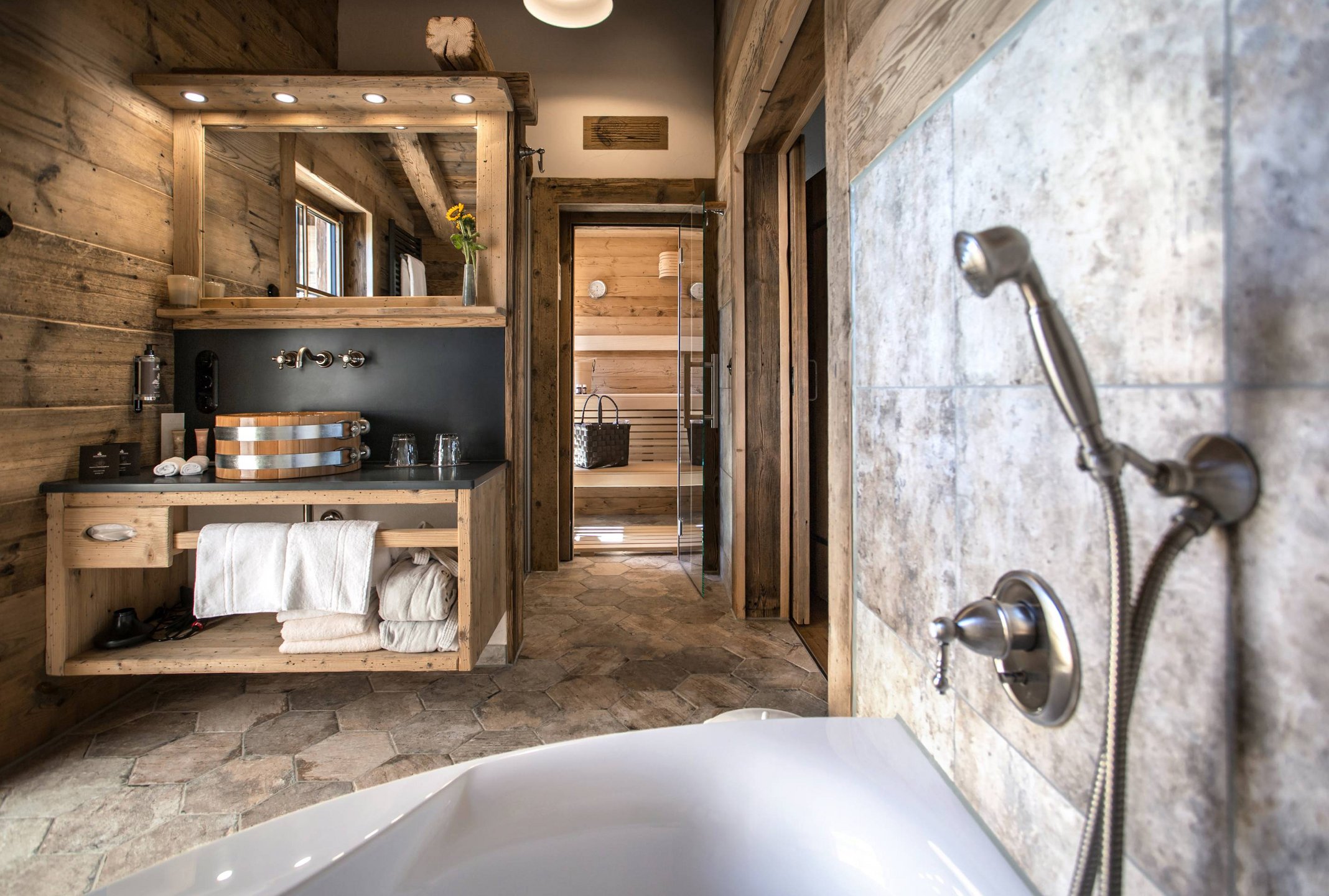 Für wohlig warme Stunden sorgen die private Sauna im Chalet, der Warmwasserzuber, die große Badewanne und der Kamin mit Kuschelecke.